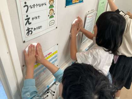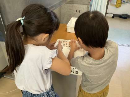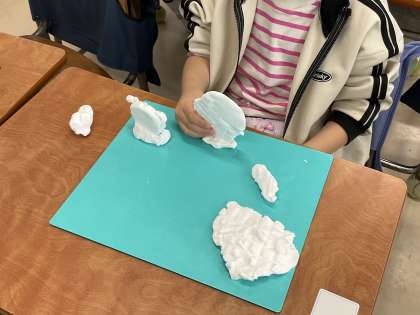 「いろんなともだちはなすだす」では、紙粘土で学校にある凹凸に型押しし、顔や土台をつけて粘土の友達を作る活動をしました。壁やカゴ、ボールなど様々な型押しをして、できる形から友達作りを楽しんでいました。