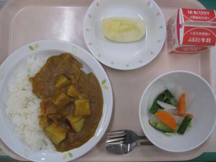 さつまいものカレーライス 牛乳 ピクルス くだもの(りんご)