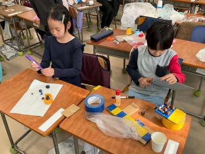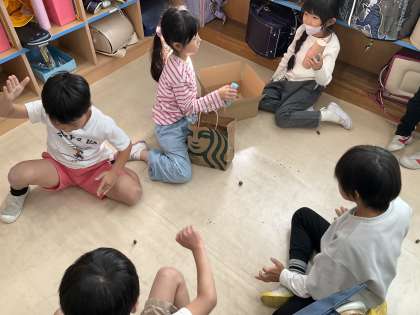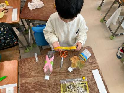 「あきとともだち」では,秋の自然を使ったおもちゃ作りをしました。10月の遠足で拾ったどんぐりや松ぼっくりなどを使って,こまやけん玉,アクセサリーやマラカスなど,様々なおもちゃを作り,遊び合いました。