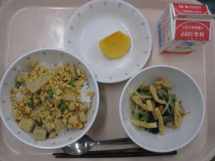高野豆腐入り親子丼 牛乳 カリカリお揚げのおひたし くだもの(柿)