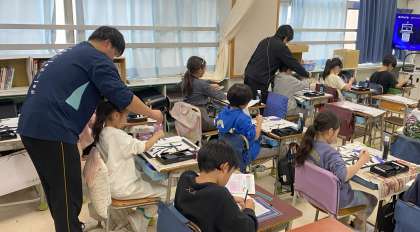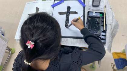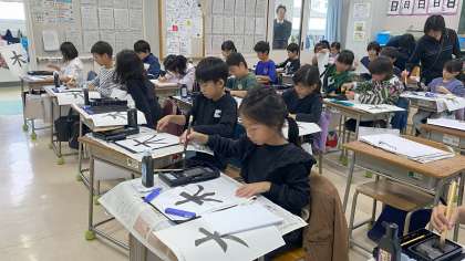 書写の学習をしています。「木」の文字をはらいに気を付けて練習しました。緊張感をもって真剣に取り組んでいました。