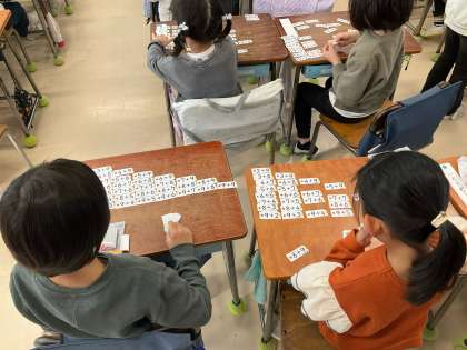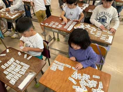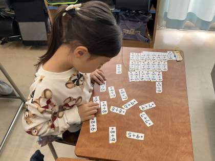 「たしざん」の学習をしています。繰り上がりのある足し算の計算カードを使って、答えが同じもの同士をまとめました。カードを並べながら、足し算と答えの決まりに気がつきました。