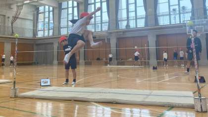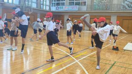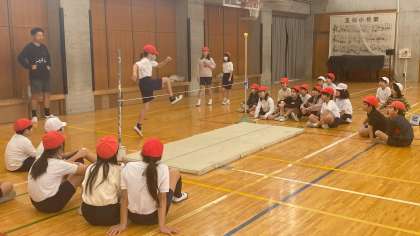「跳の運動」に取り組んでいます。補強運動では、振り上げ脚を高く上げる練習をしました。跳び越すことができたら、どうして跳び越すことができたのか、言葉で説明できるようにしました。