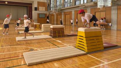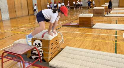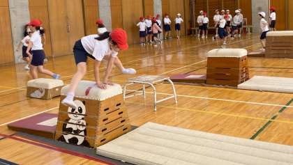 「とび箱運動」の学習を進めています。踏み切り、着手、着地でめあてを立てて、取り組んでいます。工夫した場の練習で自信をつけ、初めて跳び越せた子もいました。