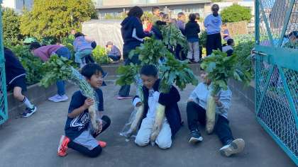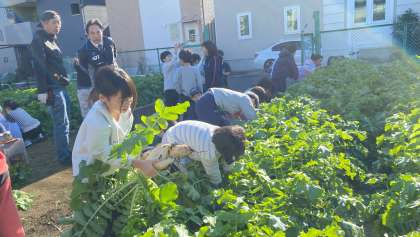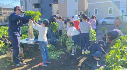 土の中にあった大根は、ヒンヤリ冷たく「手が冷たい!」と声を上げていました。収穫した後は、農家の方が葉を束ね、ビニール袋に入れてくださいました。子どもたちは「お母さんが喜ぶ!」と笑顔で大きな大根を持ち帰りました。