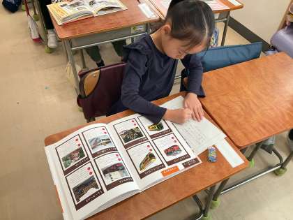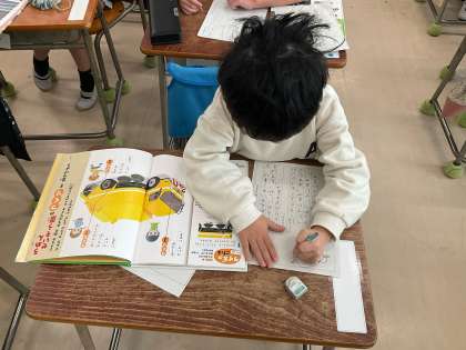 「じどう車ずかんをつくろう」の学習では,「じどう車くらべ」で学習したことを思い出しながら,自動車の本から車を選び,仕事と作りをまとめました。救急車や消防車,パトカーやタクシーなど,身近な自動車について知ることができました。