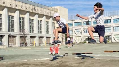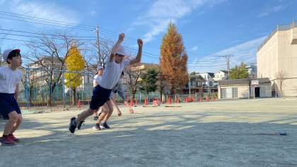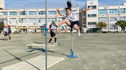 「陸上運動」走り幅跳び、走り幅跳びの学習に取り組んでいます。記録を伸ばすために、どのように体を操作したらよいか、よく考えて練習していました。