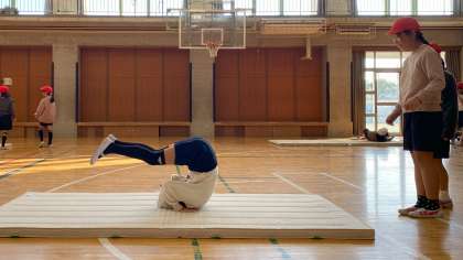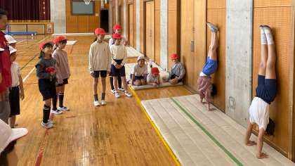体が慣れてきたところで前転、後転、壁倒立、側方倒立回転の技に挑戦しました。これから技のポイントをみつけて、よりよい動きを目指していきます。