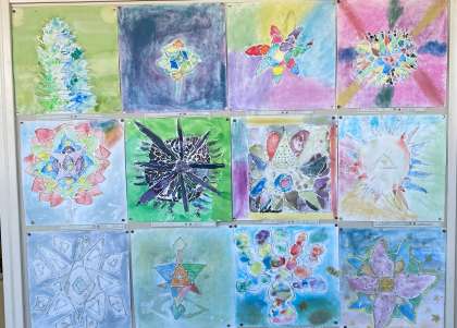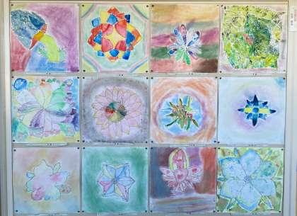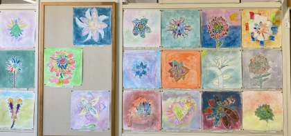 「にじんでひろがる」の作品です。ボンドで描いたお花に、にじみの技法を使って色をつけました。宇宙と同時に生まれた花、夜になるとカラフルになる花、ユニコーンの森にだけ咲く花…などイメージ豊かに表しました。