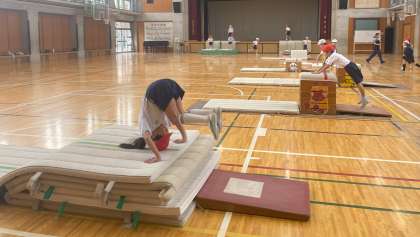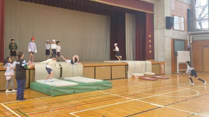たくさんの工夫した場を協力してつくりました。めあての技を達成するために適した場を選択して取り組みました。着地でピタッと止まり、ポーズを決めている子がたくさんいました。台上前転では、体を支えて回転する感覚を身に付けていました。