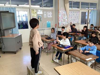 「なぞなぞをたのしもう」では,なぞなぞを作りました。作ったなぞなぞは,クラス全体で共有し,問題を出し合いました。