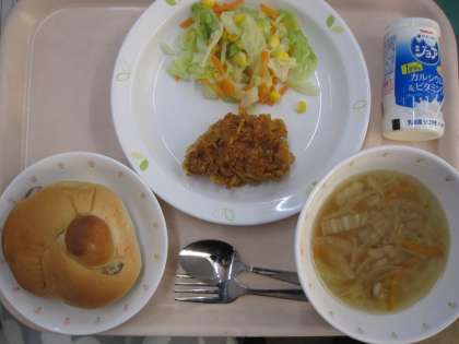 ぶどうパン ジョア ロックチキン コーンサラダ ジュリエンヌスープ