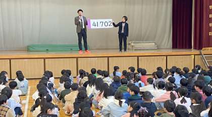 全校朝会で持久走大会担当の教員から持久走月間の取り組みについてお話しました。全校児童が協力をして目標を達成すると、ロング昼休みが設定できると聞き、子どもたちは目を輝かせていました。41702週は、子どもたちが2学期に走った記録です。持久走大会まで、60000週を目標に子どもたちは走ります。