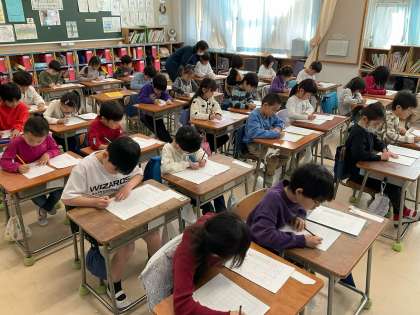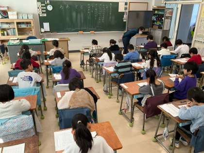 1年生は,各教室にて席書会を行いました。足を床にしっかりつけて,姿勢を整えて,お手本をよく見ながら書き初めを書きました。一人一人が集中して取り組みました。