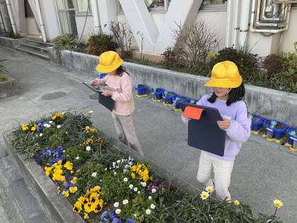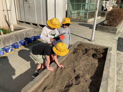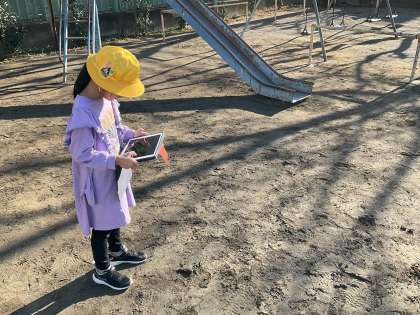 「玉づつみたんけんたい〜きせつを見つけよう〜」の学習をしています。校庭に出かけ,冬を見つけにいきました。木に葉っぱがなくなっていることや,日陰では地面が湿っていることなど,夏や秋との違いを見つけ,たくさんの発見がありました。