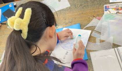 「フロッタージュ クリーチャー」の学習をしています。まず、凸凹のある面に薄い紙を置き、模様を写し取ります。できた模様からイメージを広げて表現しました。子どもたちは夢中になって取り組んでいました。