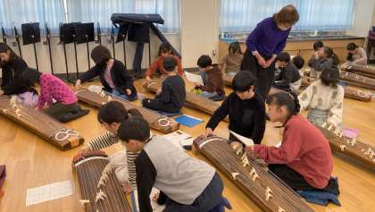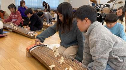 箏演奏体験は、本校の特色ある教育活動の一つです。地域の方3名の講師の先生をお招きして、授業を行いました。箏の歴史、座り方、弾き方について学び、「さくらさくら」の演奏に挑戦しました。授業の終わりには、弾くことができるようになりました。