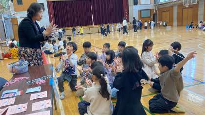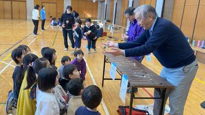 「ふゆと ともだち」 昔遊びの仕方を学び、みんなで遊びました。城南環境学習支援グループの皆様から上手にできるコツを教えていただきました。けん玉、コマ、だるま落とし、あやとり、お手玉、ボタン回し等、楽しみながら上手になっていきました。