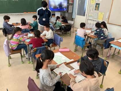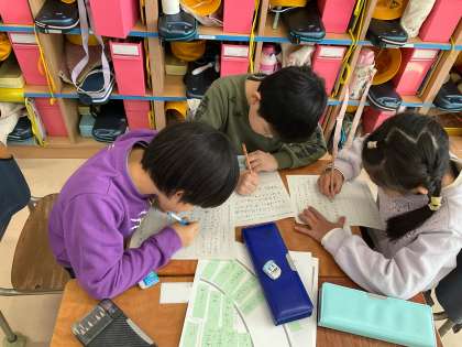 来週の生活科発表会に向けて準備をしています。「玉づつみたんけんたい〜きせつを見つけよう〜」の学習でまとめた季節のシートを見ながら、季節のことについて話す原稿作成をグループで話し合いながら行いました。