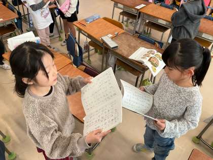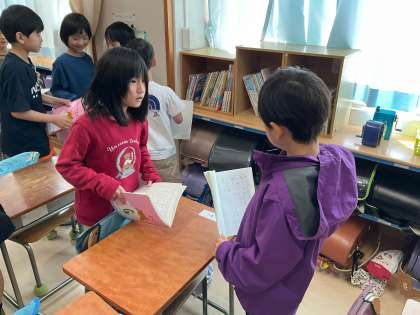 むかしばなし「わらしべちょうじゃ」のお話を聞いて、感じたことを友達と共有し合いました。