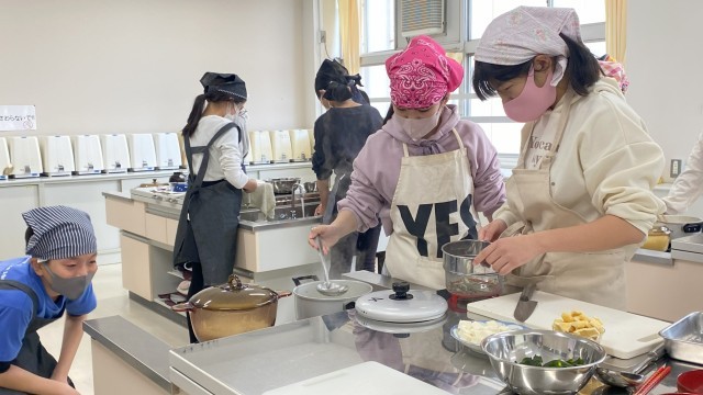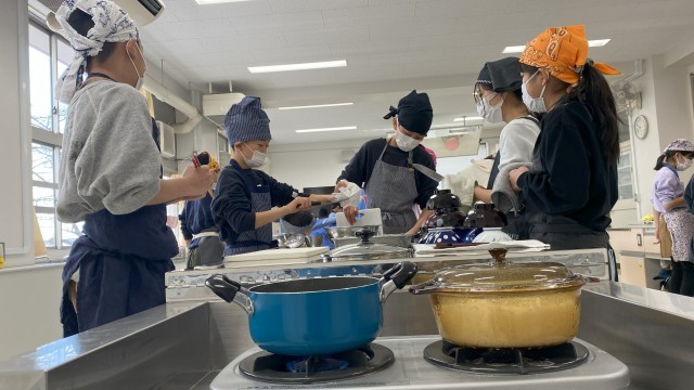 班の友達と協力して調理していました。