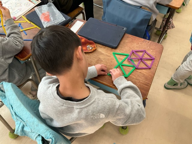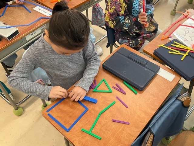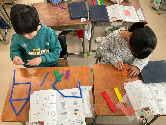 「かたちづくり」の学習では、様々なかたちづくりをしています。今回は数え棒を使って、端を繋ぎ合わせながら形を作りました。