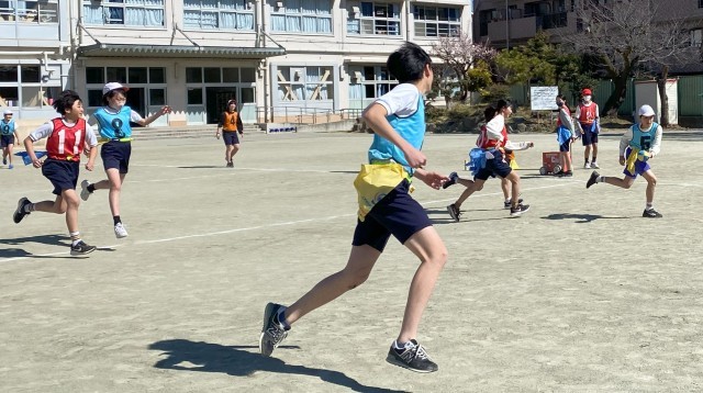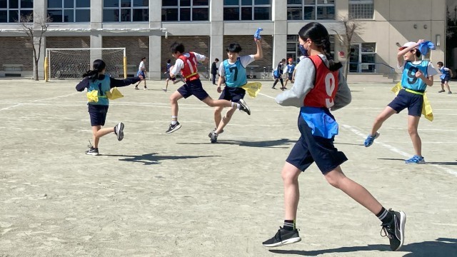 「フラグ・フットボール」の授業、4時間目になります。作戦が成功して、得点できた時は大喜びです。パスをしたり、キャッチしたりする技能が向上し、よりゲームを楽しんでいる姿を見ることができました。