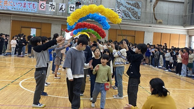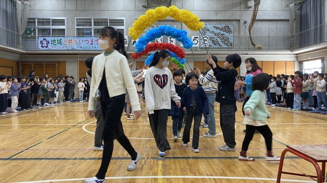 1年生と6年生が手をつないで入場しました。花のアーチを担当したのは、3年生、4年生です。体育館の飾りは1、2年生が担当しました。