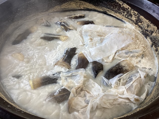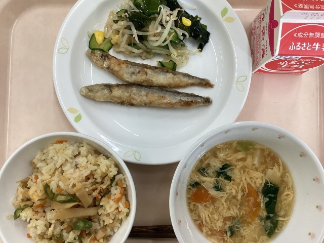 たけのこは、新たけのこを給食室で朝から煮てあくぬきをしました。