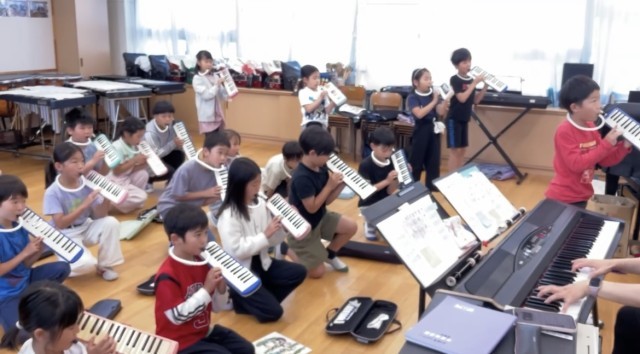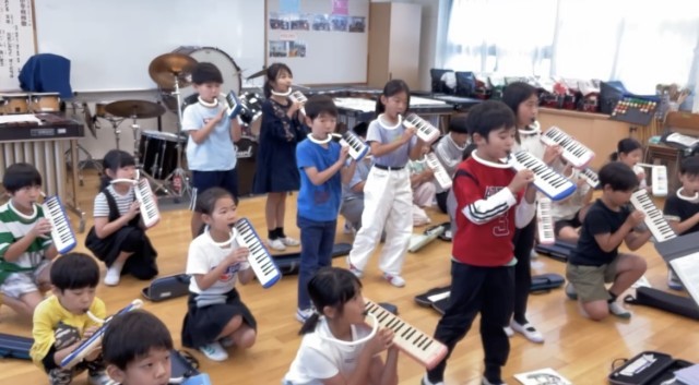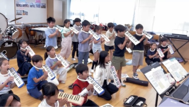 歌詞で歌ってから、階名 (ドレミ) で歌う練習をしました。鍵盤ハーモニカでのリレー演奏にチャレンジし、担任の先生の前で発表しました。4チームそれぞれのメロディがきれいにつながるようタイミング良く演奏することができました!子どもたちは担任の先生から「綺麗な音で和みました」と感想をもらえて、嬉しそうでした。