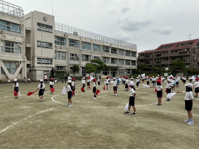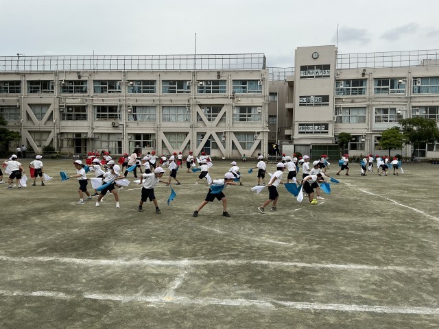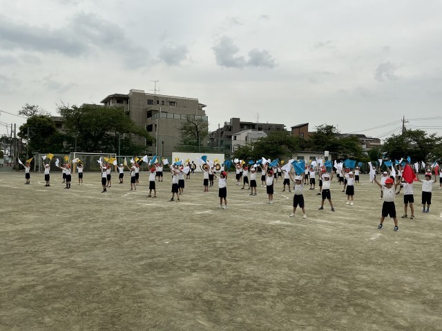 校庭で運動会の練習をしました。隊形が変わる場面も自分の位置をしっかり覚えて移動することができました。