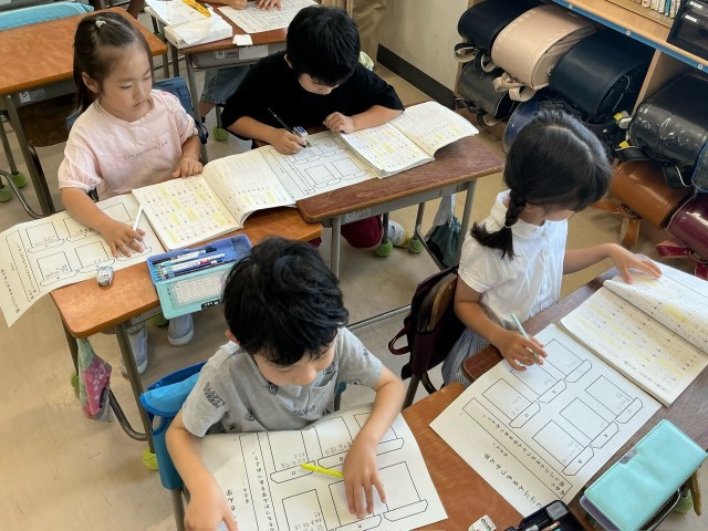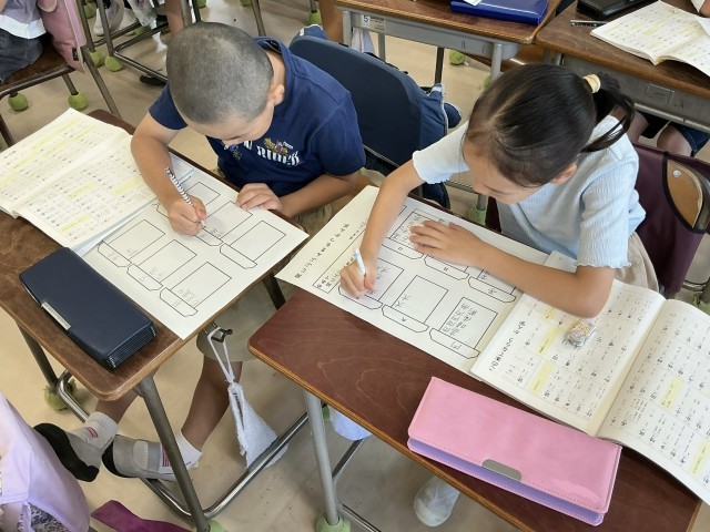 国語「同じぶぶんをもつかん字」では、同じ部分をもつ漢字を教科書を使って調べ、部分ごとに分けて書き出しました。