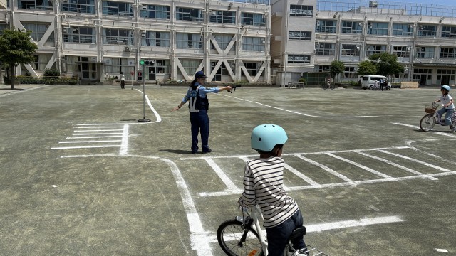 信号のある交差点や見通しの悪い交差点での進み方、駐車車両の追い越し方、ヘルメットの調節などを実践的に学びました。