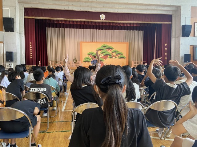 尾山台小学校の6年生とともに、抑揚をつけた話し方や泣く動作などを体験し、古典芸能について学びました。