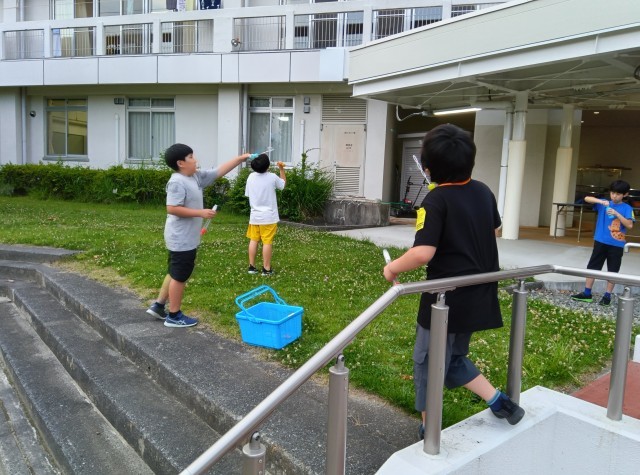 子ども会で他校と交流しました。夕食後、シャボン玉で遊びました。大きなシャボン玉を作り、子どもたちは、大喜びでした。
