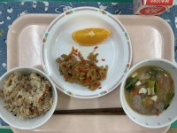 豆いりひじきごはん牛乳れんこんのきんぴらいわしのつみれ汁オレンジ節分なので、大豆...