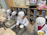 いつもおいしく給食を食べています。子どもたちが給食当番をしている様子です。みんな...