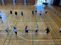 とび遊びの学習が始まりました。まずは、ペアになって跳ぶ準備運動をしました。その後...