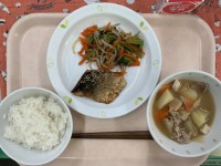 ごはん牛乳さばのうまだれ焼き野菜のおかかあえ豚汁今日の魚は、しょうが、にんにく、...