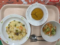 シーフードピラフ牛乳キャベツサラダかぼちゃのマフィンマフィンのかぼちゃは皮のまま...