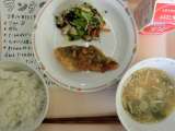 今日の給食は、ごはん、牛乳、たらのねぎソース、ちくわ入り磯辺和え、わかめのみそ汁...