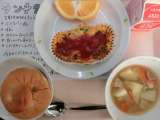 今日の給食は、ブドウパン、牛乳、カラフルオムレツ、白インゲン豆のスープ、くだもの...