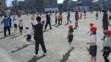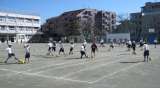 長縄跳びをして遊んでいる子がたくさんいます。1年生のグループは教員と支援員が回し...