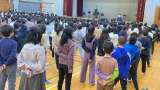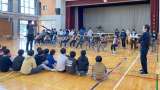 体育館で音楽朝会を行うのは、4年ぶりになります。合奏クラブの児童が、「宝島」の演...