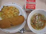 今日の給食 ぶどうパン 牛乳 マカロニグラタン キャベツときのこのスープ 産地...