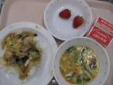 今日の給食 中華丼 牛乳 中華風コーンスープ 果物 いちご 産地情報 に...