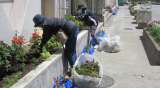校庭の環境整備をしているところです。雑草の処理には、バーナも使用しています。