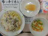今日の給食は、スパゲティクリームソース、牛乳、コーンサラダ、くだもの(ジューシー...