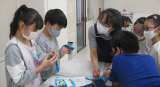 「ココロ仮面」の作品づくりをしています。電動糸のこぎりや千枚通し、紙やすり等を使...