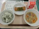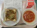 今日の給食は、きんぴらトースト、牛乳、ミネストローネスープです。 今日の給食食...